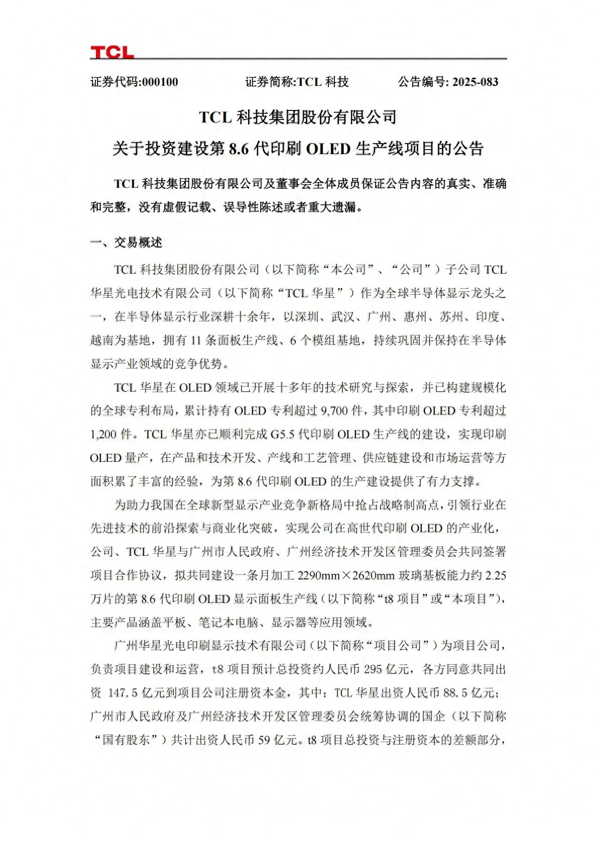 9月12日,TCL科技集团股份有限公司(000100.SZ)发布公告,公司、旗下子公司TCL华星与广州市人民政府、广州经济技术开发区管理委员会共同签署项目合作协议,拟共同出资于广州市建设一条月加工2290mm×2620mm玻璃基板能力约2.25万片的第8.6代印刷OLED显示面板生产线(简称“t8项目”),主要产品涵盖平板、笔记本电脑、显示器等应用领域,预计总投资额约人民币295亿元。